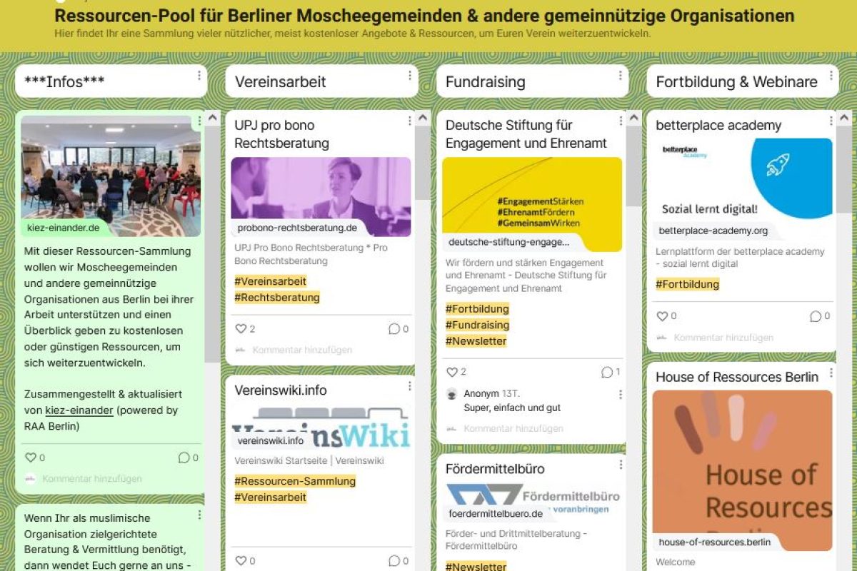 Ein zentrales Anliegen ist, Frauen und Jugendliche gleichberechtigt mitzudenken. Neben individueller Beratung hilft kiez-einander auch bei der Vernetzung: mit anderen Moscheegemeinden, zivilgesellschaftlichen Initiativen oder politischen Akteur:innen. Außerdem vermittelt das Projekt Informationen zu Ressourcen – etwa zu Weiterbildungen, Fördermitteln oder Angeboten politischer Bildung.